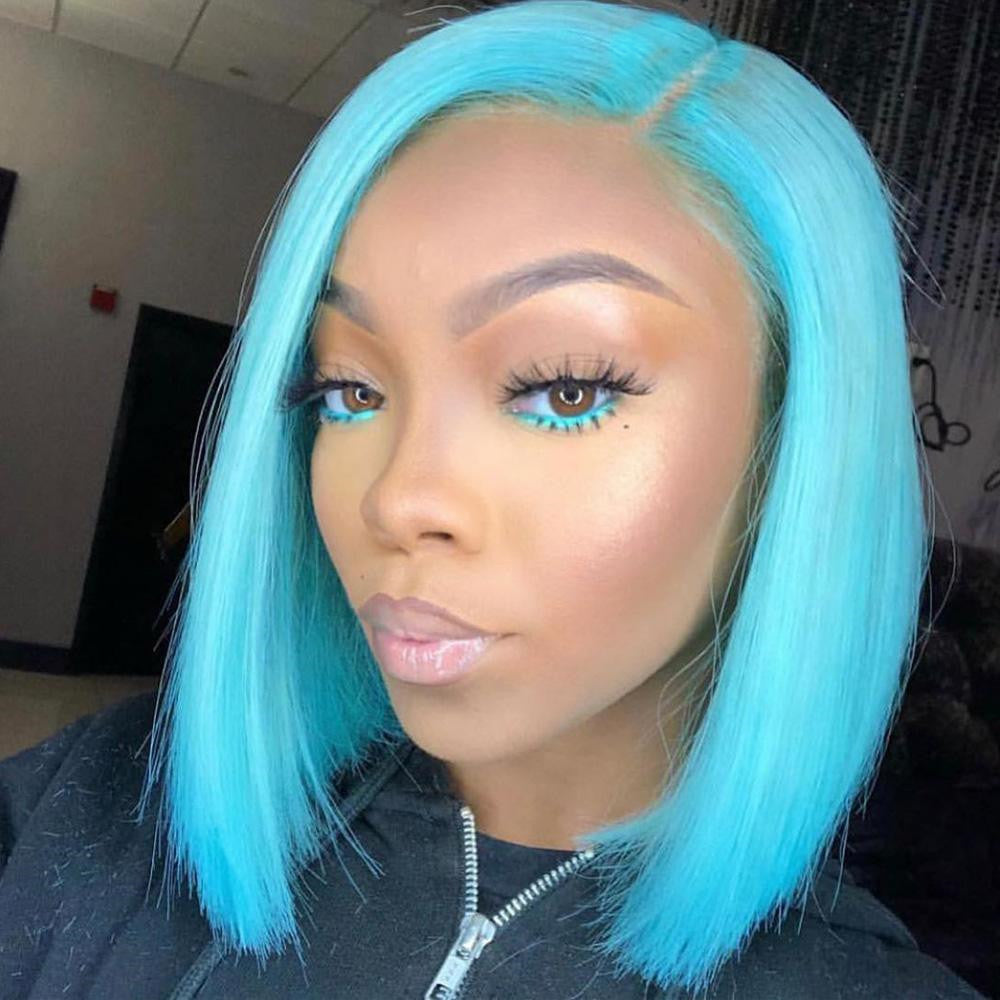 Real Human Hair Lace Front Bob Wigs Blue Color Straight Style