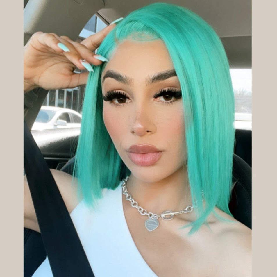 Real Human Hair Lace Front Bob Wigs With Tiffany Blue Color